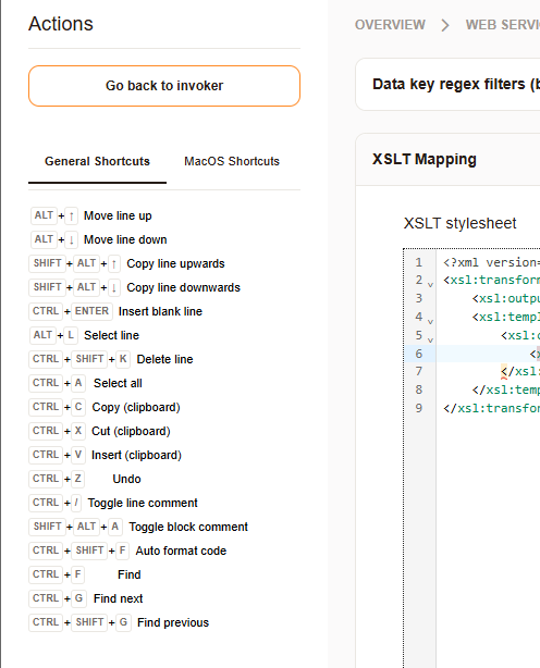 Znuny provides data modification with XSLT. It’s then possible to modify the incoming and outgoing data for provider and requester operations. It provides syntax highlighting, code completion, and validation features to help you write correct XSLT code. After adding the XSLT option, and saving the provider or invoker configuration, you can than edit the XSLT code in the editor.