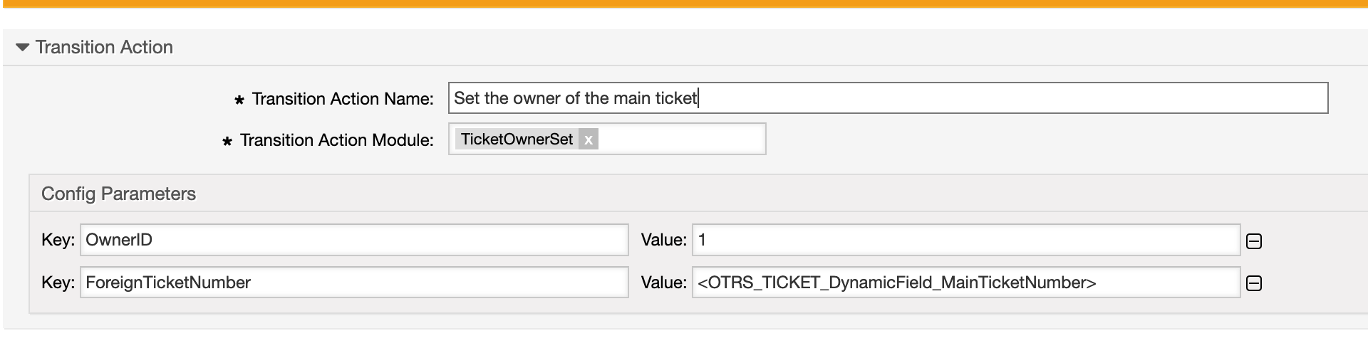 With the parameters ForeignTicketID or ForeignTicketNumber, it is possible to execute a transition action module on behalf of another ticket.
