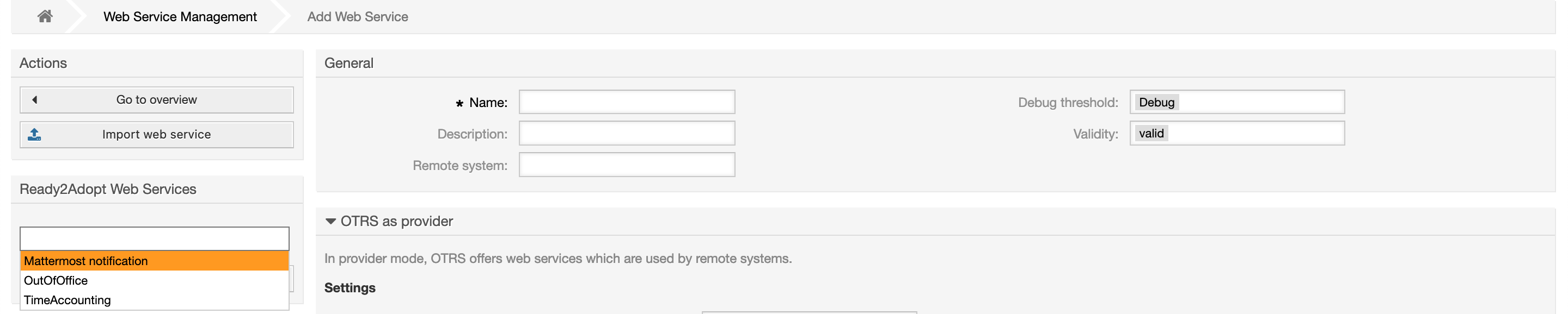 Open the Web Service Management in the from the Admin Overview and click on Add Web Service.
