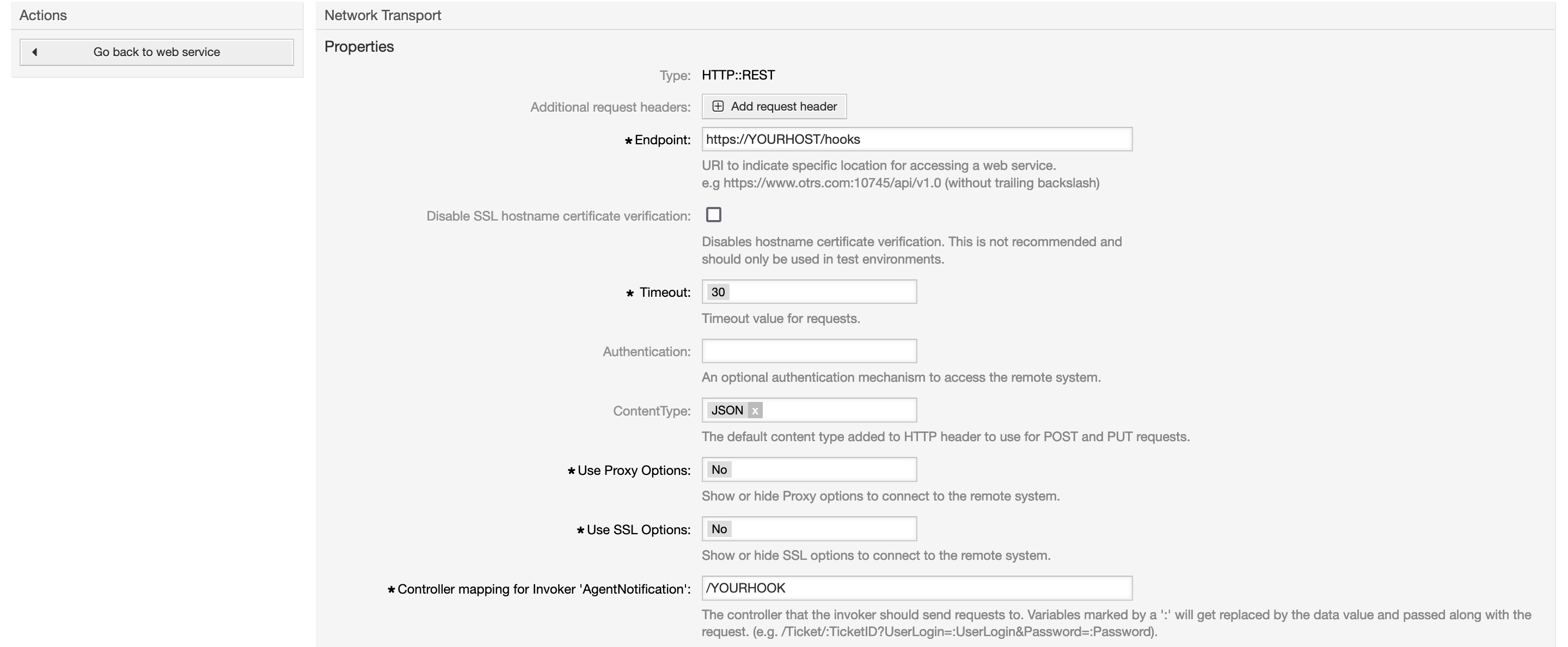 Replace YOURHOST in the Endpoint setting with the hostname of the webhook and YOURHOOK of the controller endpoint with the corresponding part of the webhook: